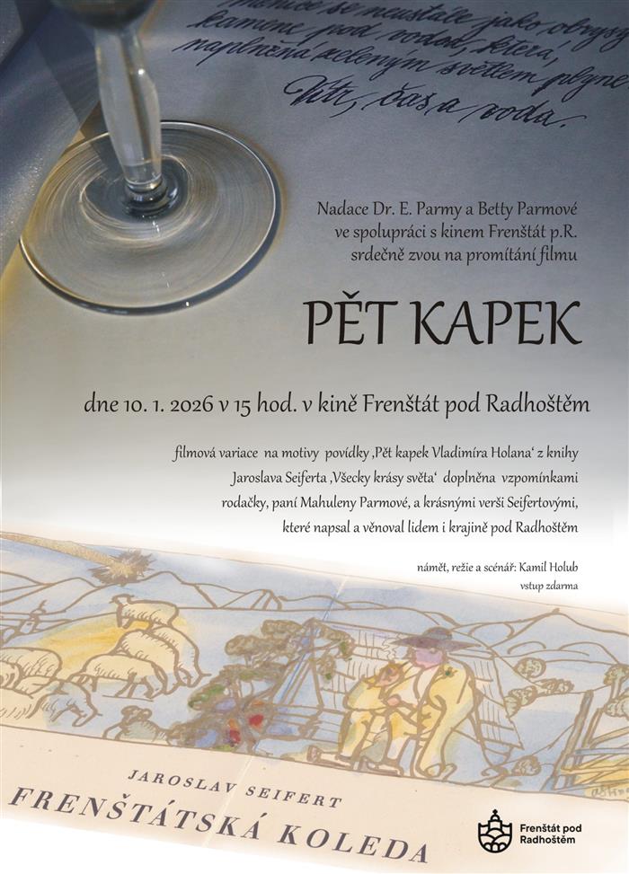 Promítání filmové variace na motivy povídky "Pět kapek Vladimíra Holana" z knihy Jaroslava Seiferta "Všecky krásy svět" doplněna vzpomínkami rodačky, paní Mahuleny Parmové, a verši Seifertovými, které napsal a věnoval lidem i krajině pod Radhoštěm. Srdečně zve Nadace Dra Edvarda Parmy a Betty Parmové ve spolupráci s městem Frenštát pod Radhoštěm.